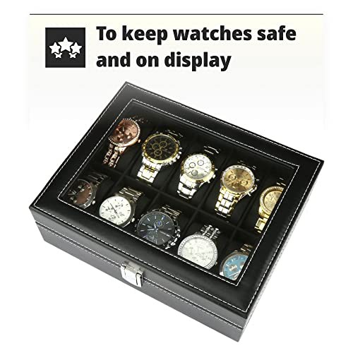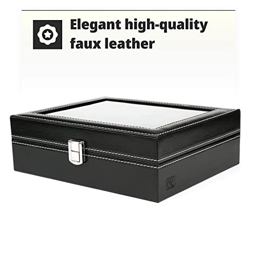 H&S Glass Lid 10 Watch Jewellery Display Storage Box Case - Faux Leather Black Watch Box For Men Women - Watch Display Case - Jewellery Box - Watch Organiser Box For Men - Mens Watch Storage Box