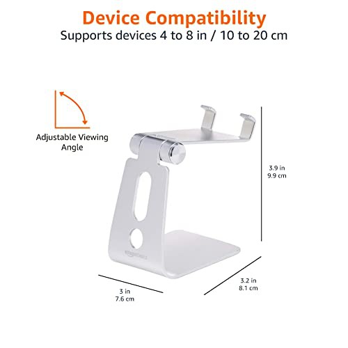 Amazon Basics Adjustable Aluminum Phone Stand for Cell Phones, iPhone and Android, 8.1 x 7.6 x 9.9 cm, Silver