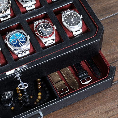 Watch Box with Valet Drawer for Men - 12 Slot Luxury Watch Case Display Organizer, Microsuede Liner, Locking Mens Jewelry Watches Holder, Men's Storage Boxes Holder Large Glass Top