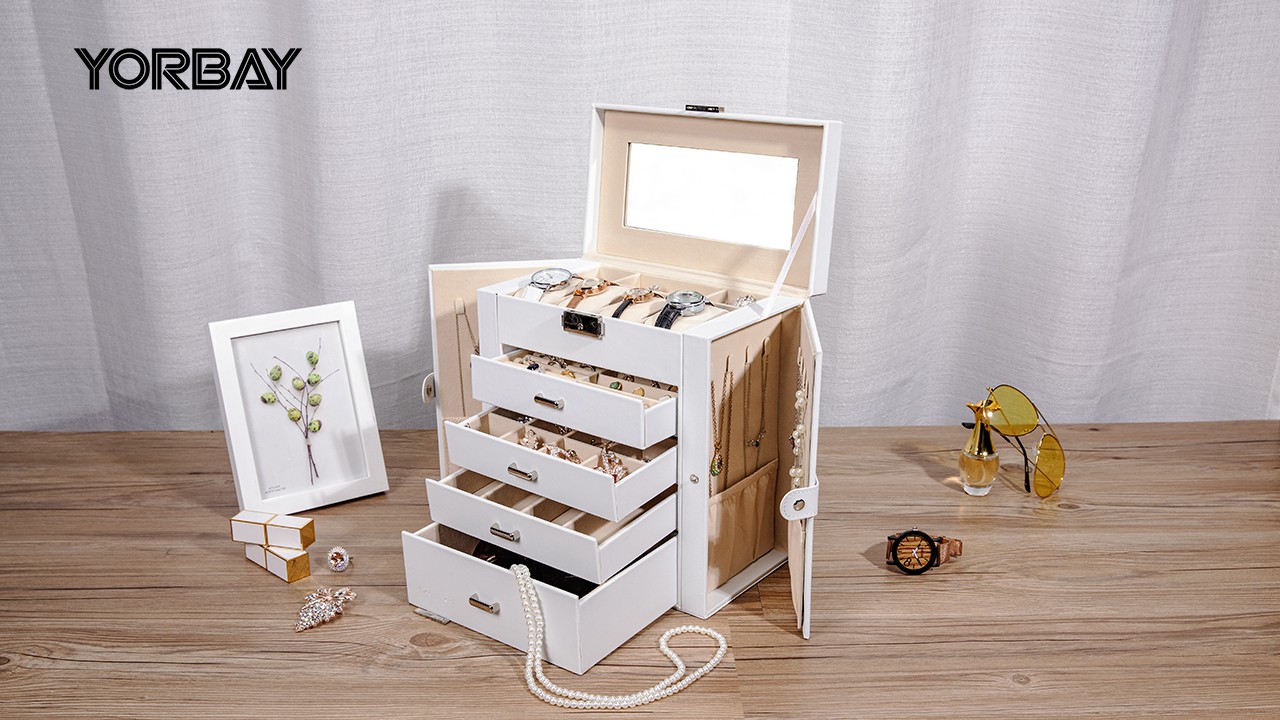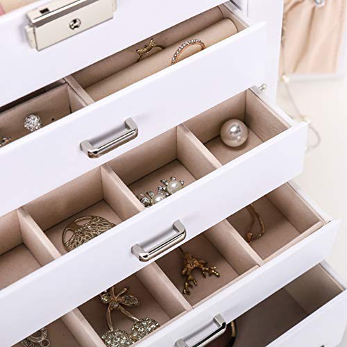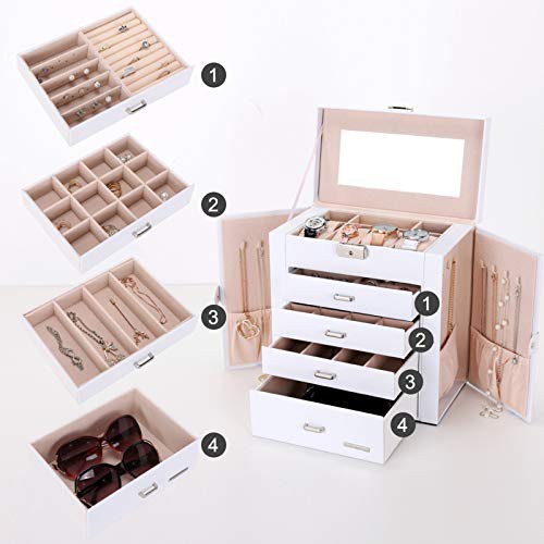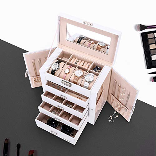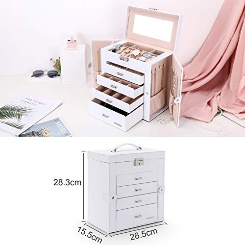 Seelux Large Jewellery Box, 5-Layer Jewelry Storage with Drawers, Mirror and Lock, Watch Box, Gift Case for Necklaces, Rings, Bracelets, Watches, Earrings, Faux Leather, White