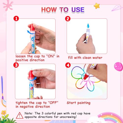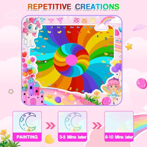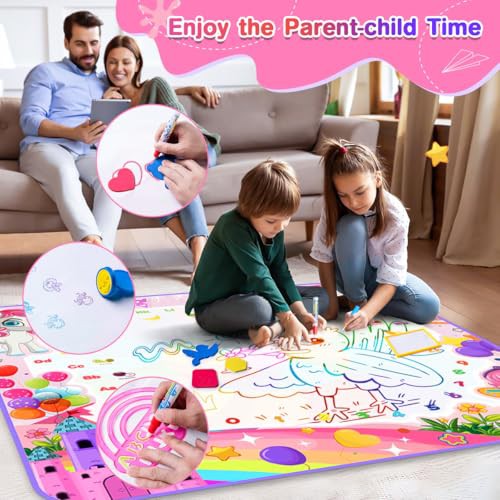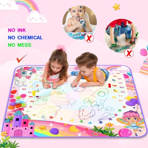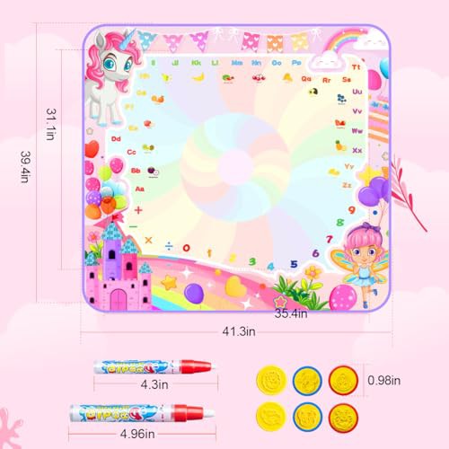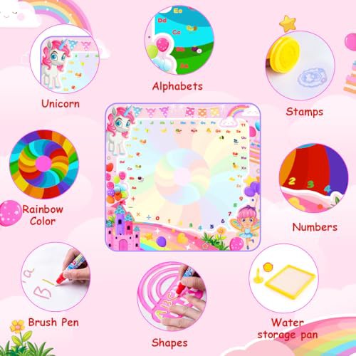 Water Doodle Mat, 105X100cm Mess Free Water Drawing Mat with 5 Water Pens, 6 Animal Stamps, Unicorn Educational Toys Gifts for 3 4 5 6 7 8 Year Old Girls