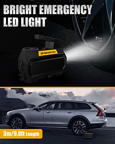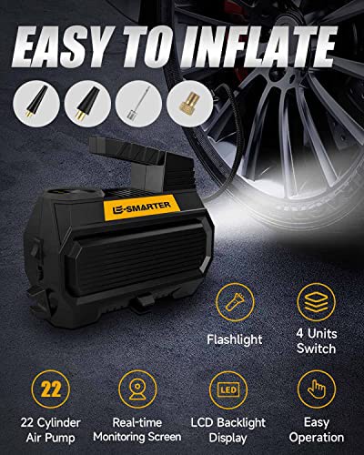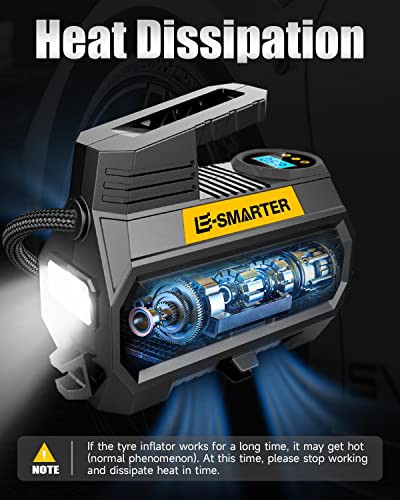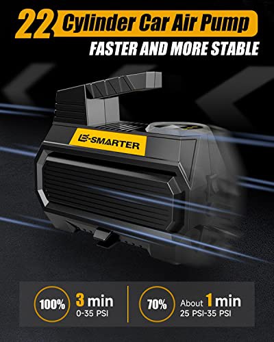 E-SMARTER Car Tyre Inflator Air Compressor, 12V/ 120W/ 150 PSI/ 10.5 Bar, Car Tyre Pump with Handle, 4 Valve Adaptors, LED Light, 2xFaster Car Pumps for Tyres of Car, Bike, Motorcycle, Ball, Mattress