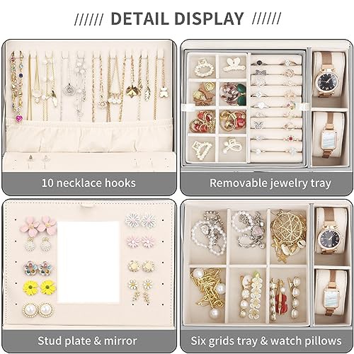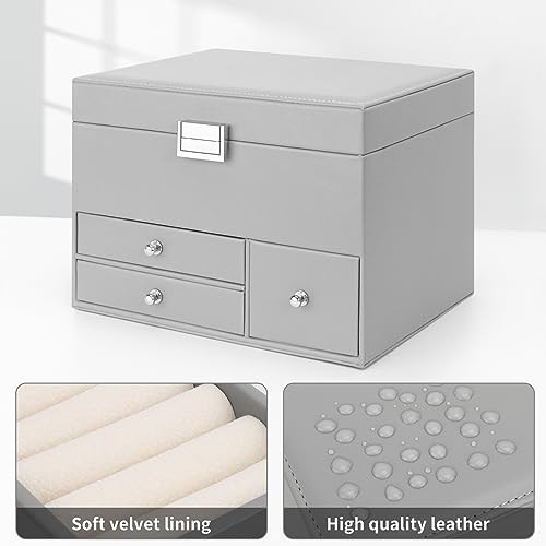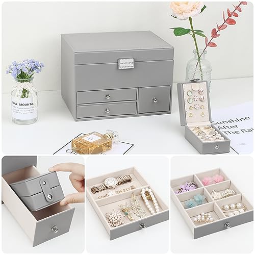 Casiwaft Jewellery Box Organiser, 3 Layers Large PU Jewelry Storage Case with Portable Case, Jewellery Box with Removable Tray and Mirror for Necklace Earring Ring Watch, Grey