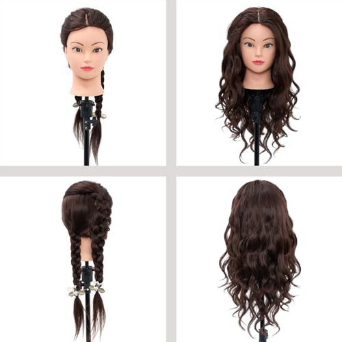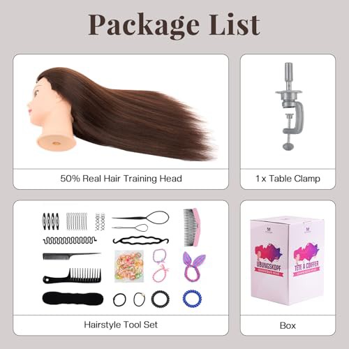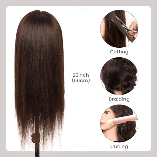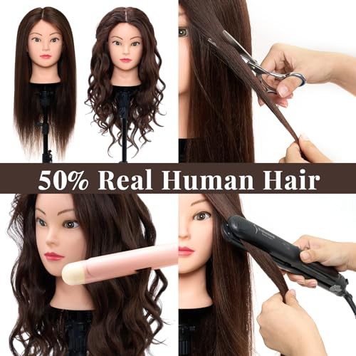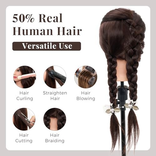 Neverland Hairdressing Head 50% Real Hair Training Head 22 Inch Cosmetology Mannequin Styling Dolls Head for Hairdressers Braiding/Styling/Cutting/Curling with Clamp and Braid Set