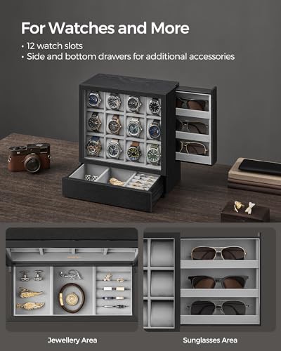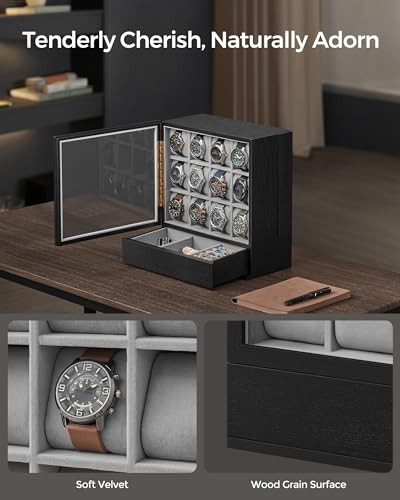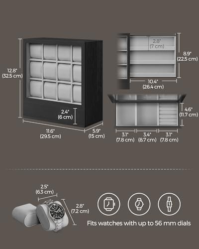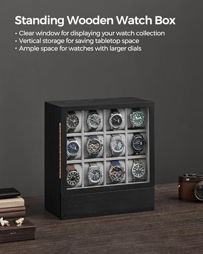 SONGMICS 12-Slot Wooden Watch Box, Watch Display Case with Window, Watch Display Cabinet with Solid Wood Veneer, Vertical Storage, Space Saving, Gift Idea, Ebony Black JOW014B01