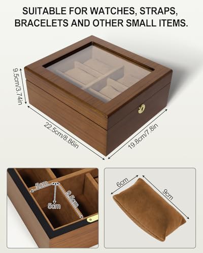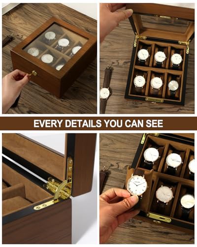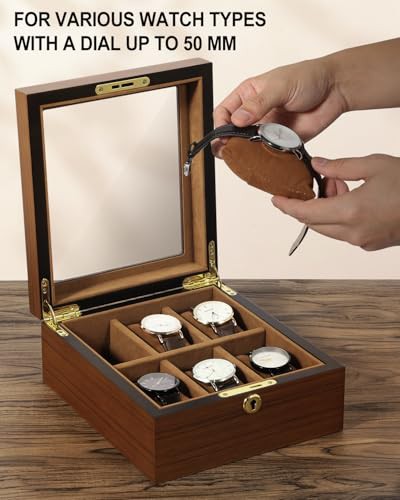Uten Watch Box with 6 Slots, Watch Case Organizer with Golden Lock and Key, Wooden Watch Display Storage Box with Removable Watch Cushions, Velvet Lining, Metal Clasp, Gift for Men & Women