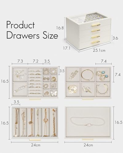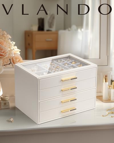 Vlando Jewellery Box with Glass Lid, 4-Tier Jewellery Organiser, Jewellery Storage with 3 Drawers for Watches,Sunglasses, Gift for Women, For Ring, Necklace, Earring, Bracelet