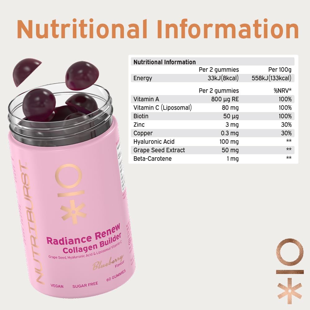 ['? SUPPORT NATURAL COLLAGEN PRODUCTION & RADIATE FROM THE INSIDE OUT. Flavoured with natural blueberry extracts, this plant based, chewable vitamin contains 6 essential micronutrients to support your body’s natural collagen production. Let’s face it, we don’t just want to feel good, we like to look healthy too. Each gummy contains Vitamin A (800µg), Vitamin C/Liposomal (80mg), Biotin (100µg), Zinc (3mg), Copper (0.3mg), Hyaluronic Acid (100mg), Grape Seed Extract (50mg), Beta Carotene (1mg).', '? SUPPORT NATURAL COLLAGEN PRODUCTION & RADIATE FROM THE INSIDE OUT. Flavoured with natural blueberry extracts, this plant based, chewable vitamin contains 6 essential micronutrients to support your body’s natural collagen production. Let’s face it, we don’t just want to feel good, we like to look healthy too. Each gummy contains Vitamin A (800µg), Vitamin C/Liposomal (80mg), Biotin (100µg), Zinc (3mg), Copper (0.3mg), Hyaluronic Acid (100mg), Grape Seed Extract (50mg), Beta Carotene (1mg).', '? SUPPORT NATURAL COLLAGEN PRODUCTION & RADIATE FROM THE INSIDE OUT. Flavoured with natural blueberry extracts, this plant based, chewable vitamin contains 6 essential micronutrients to support your body’s natural collagen production. Let’s face it, we don’t just want to feel good, we like to look healthy too. Each gummy contains Vitamin A (800µg), Vitamin C/Liposomal (80mg), Biotin (100µg), Zinc (3mg), Copper (0.3mg), Hyaluronic Acid (100mg), Grape Seed Extract (50mg), Beta Carotene (1mg).', '? SUPPORT NATURAL COLLAGEN PRODUCTION & RADIATE FROM THE INSIDE OUT. Flavoured with natural blueberry extracts, this plant based, chewable vitamin contains 6 essential micronutrients to support your body’s natural collagen production. Let’s face it, we don’t just want to feel good, we like to look healthy too. Each gummy contains Vitamin A (800µg), Vitamin C/Liposomal (80mg), Biotin (100µg), Zinc (3mg), Copper (0.3mg), Hyaluronic Acid (100mg), Grape Seed Extract (50mg), Beta Carotene (1mg).', '? SUPPORT NATURAL COLLAGEN PRODUCTION & RADIATE FROM THE INSIDE OUT. Flavoured with natural blueberry extracts, this plant based, chewable vitamin contains 6 essential micronutrients to support your body’s natural collagen production. Let’s face it, we don’t just want to feel good, we like to look healthy too. Each gummy contains Vitamin A (800µg), Vitamin C/Liposomal (80mg), Biotin (100µg), Zinc (3mg), Copper (0.3mg), Hyaluronic Acid (100mg), Grape Seed Extract (50mg), Beta Carotene (1mg).']