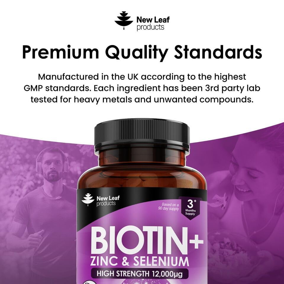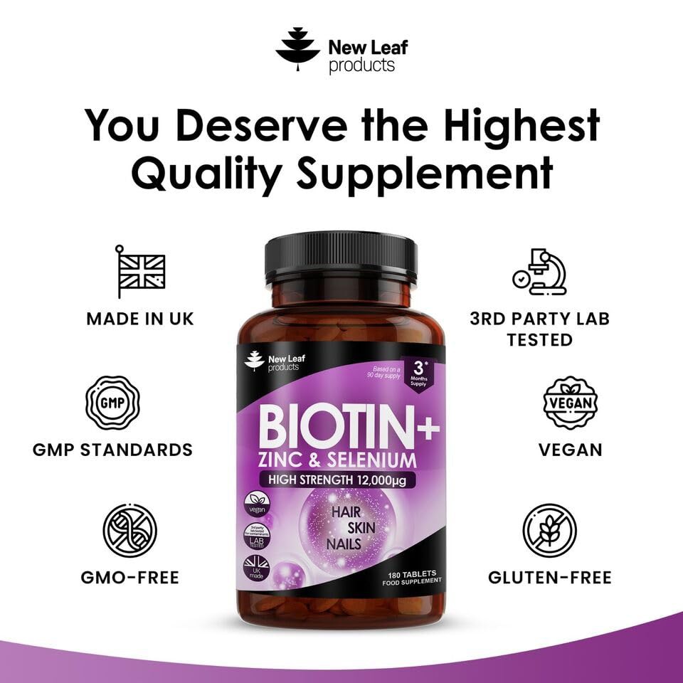 Biotin Hair Growth Vitamins 12,000mcg D-Biotin Tablets Enriched with Zinc & Selenium –Vegan Hair Skin & Nails Vitamins for Women and Men High Strength Hair Vitamins 6 Months Supply UK Made - New Leaf