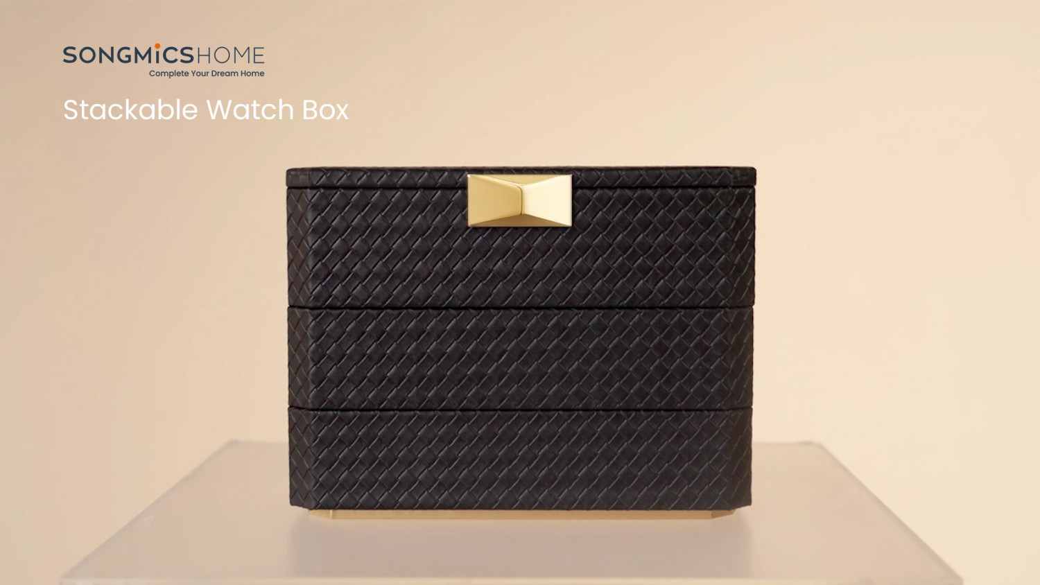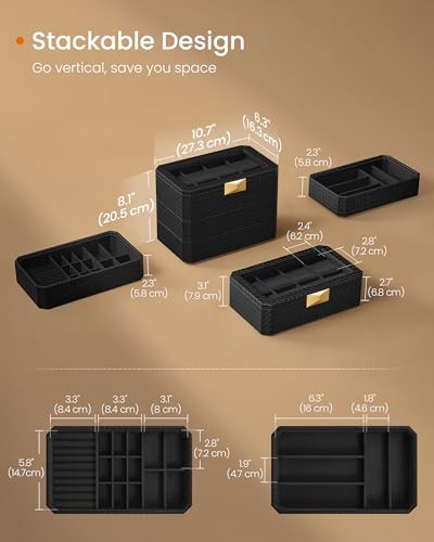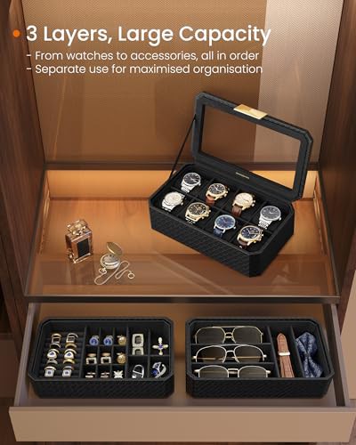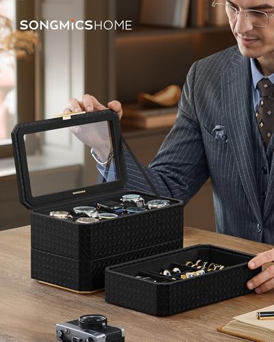 SONGMICS HOME RONNE Collection - 8-Slot Watch Box, 3-Tier Stackable Watch Case, Woven Embossed PU Leather, Floating Effect, Gift Idea, Ink Black Surface, Ink Black Lining JWB021B01