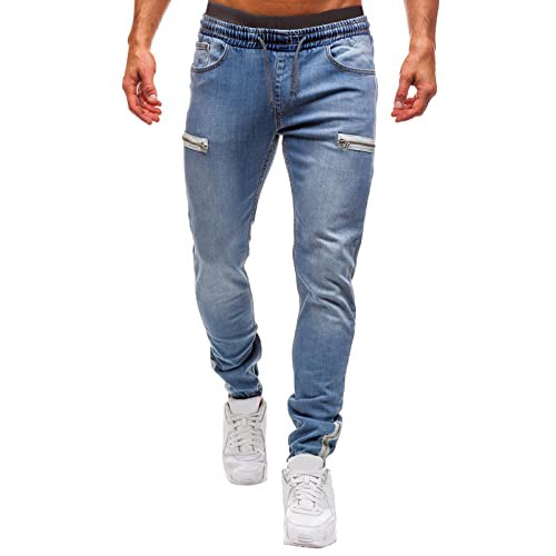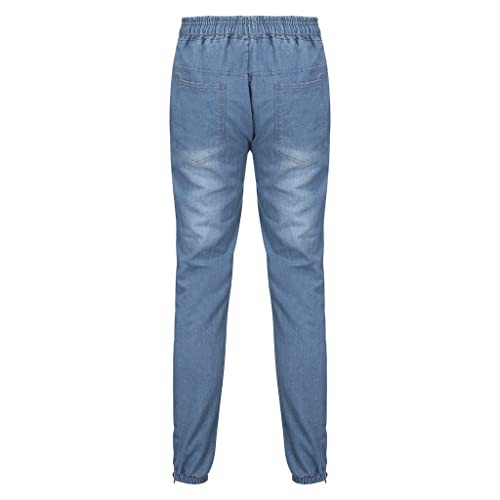 Mens Cargo Combat Jeans - Fashionable Drawstring Elasticated Waist Cuffed Trousers Joggers Men's Straight Leg Heavy Duty Cotton Jeans Casual Classic Trouser with Foot Zipper Plain Denim Wash