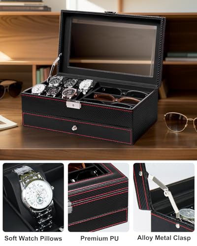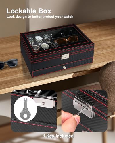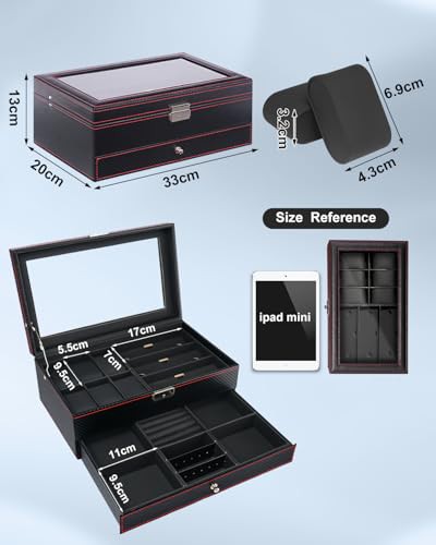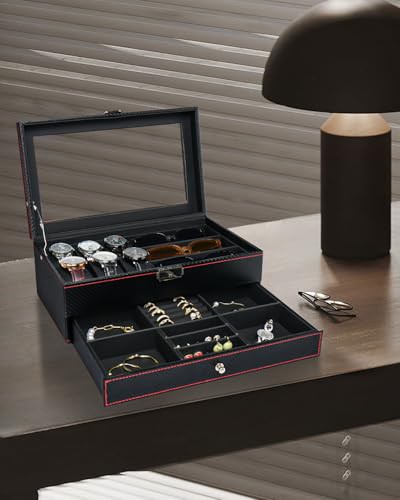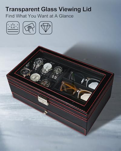 Huquter Watch Box for Men, 2 Tier Mens Jewellery Box with 6 Slot Watch Case & 3 Slot Sunglasses Organiser, Lockable PU Leather Watch Holder with Glass Lid For Earrings Rings Necklaces Bracelets, Black