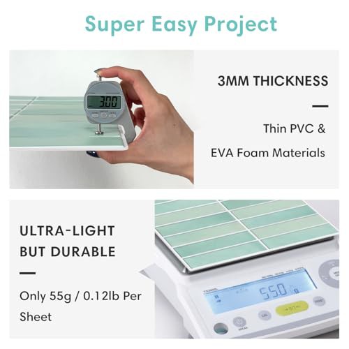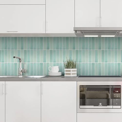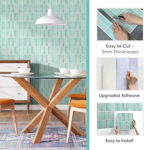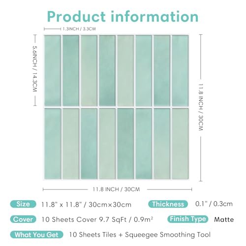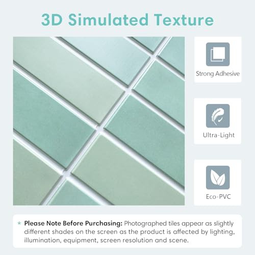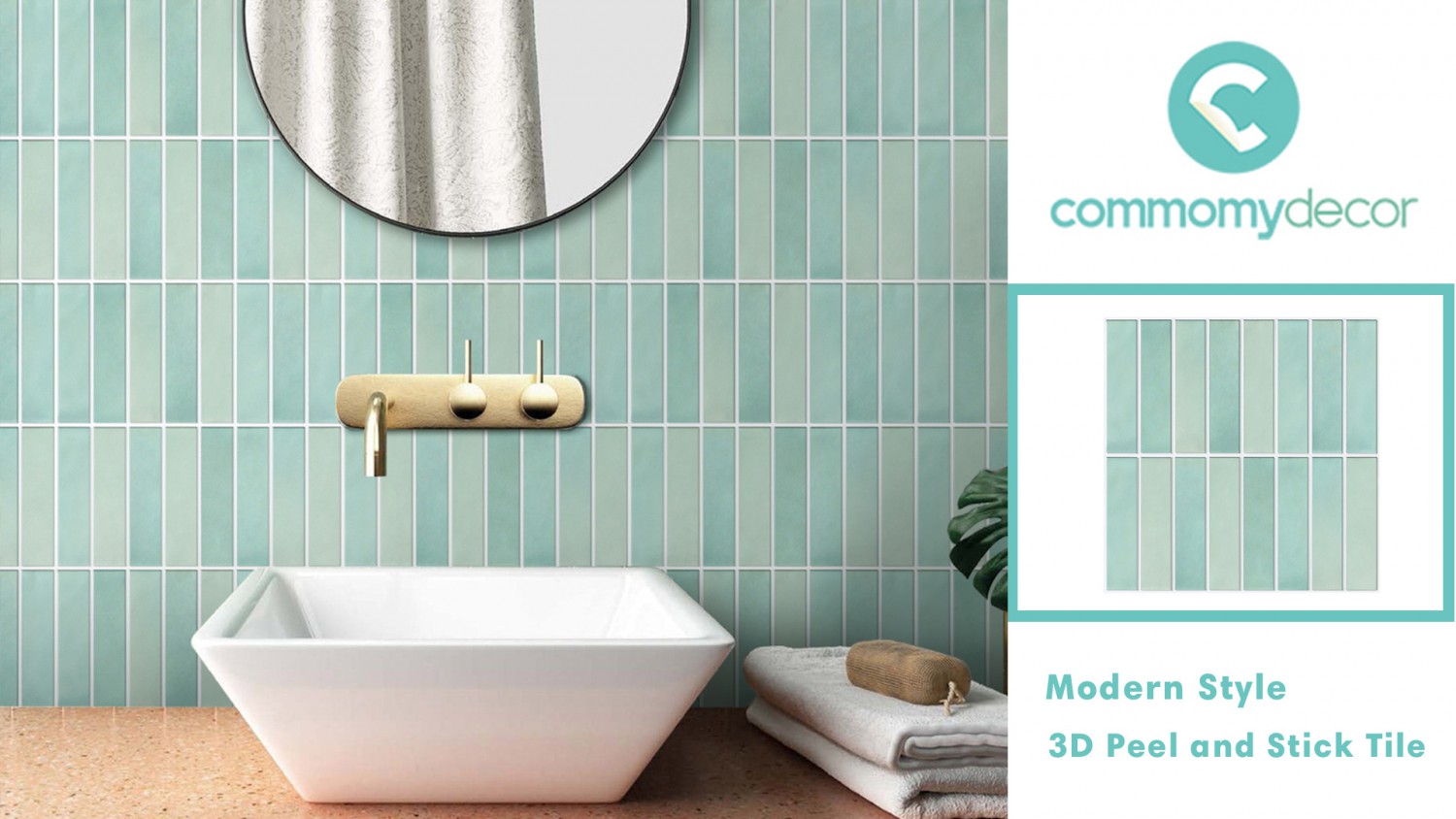 Commomy 10 Pcs Light Teal Green 3D Stick on Tiles, 11'8 x 11'8 Matte UrltraLight PVC Vertical Self Adhesive Wall Tiles for Kitchen Backsplash, Bathroom, Living Room, Bedroom, RV