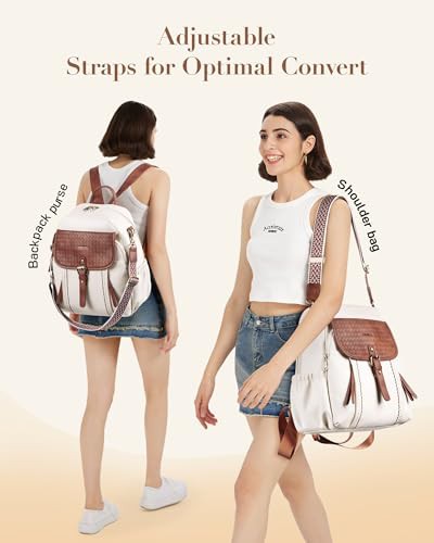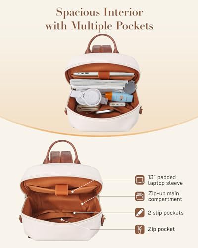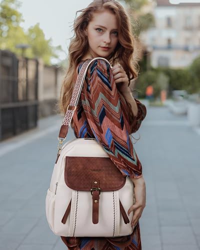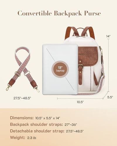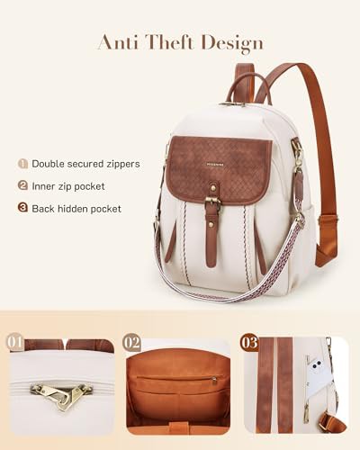 Missnine Women Anti-theft Backpack,PU Leather Ladies Fashion Multi-pocket Backpack for 13 Inch Laptop,Convertible Shoulder Bag with Secured Zippers for Daily Holidays,Brown + Beige