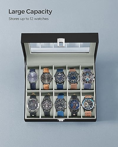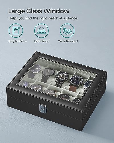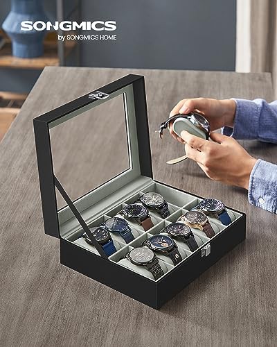 SONGMICS Watch Box with 10 Slots, Watch Case with Glass Lid, Watch Display Box with Removable Watch Pillows, Metal Clasp, Gift Idea, Black Synthetic Leather, Greenish Grey Lining JWB010BK