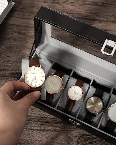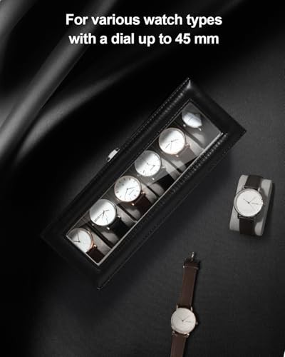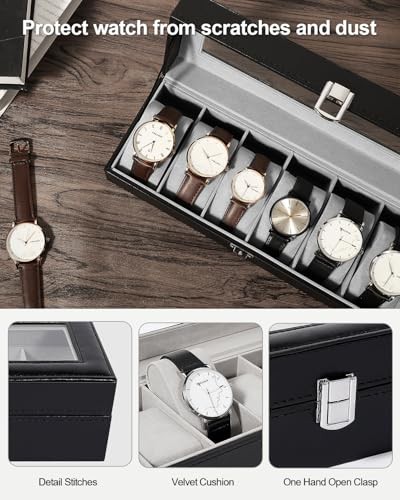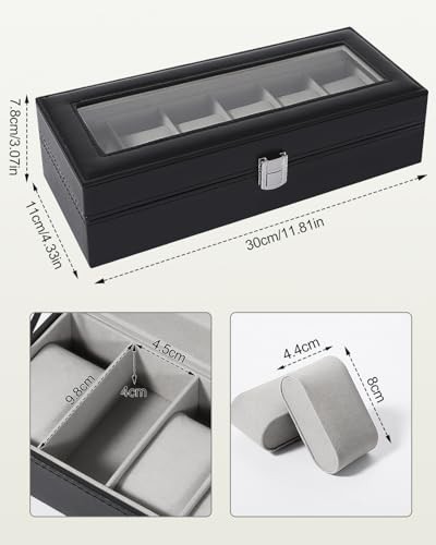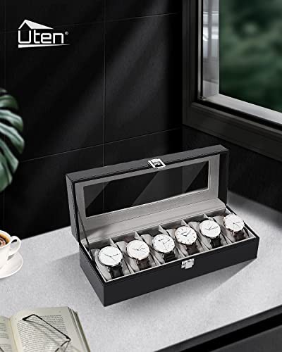 Uten Watch Box 6 Slots, Watch Case with Glass Lid, Watch Display Storage Box for Men and Women, Removable Watch Pillows, Metal Clasp, Black Synthetic Leather, Grey Velvet Lining, Gift Idea