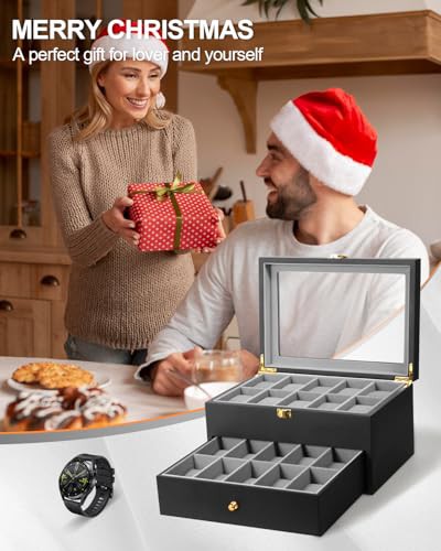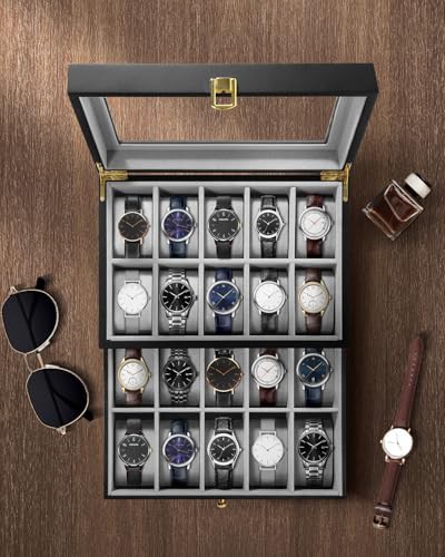 Uten Watch Box 20 Slots, 2-Tier Wood Watch Case with Glass Lid, Watch Display Storage Box for Men and Women, Removable Watch Pillows, Metal Clasp, Piano Lacquer Wood, Black Velvet Lining, Gift Idea
