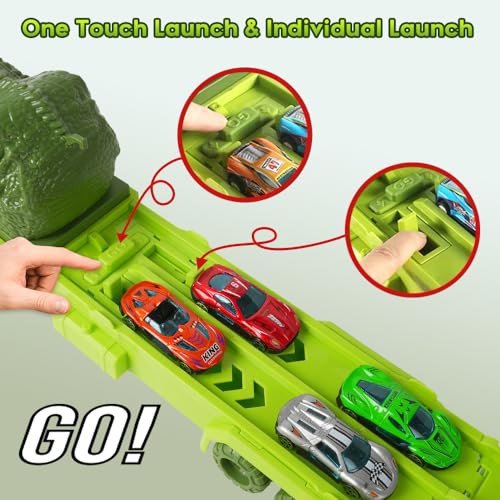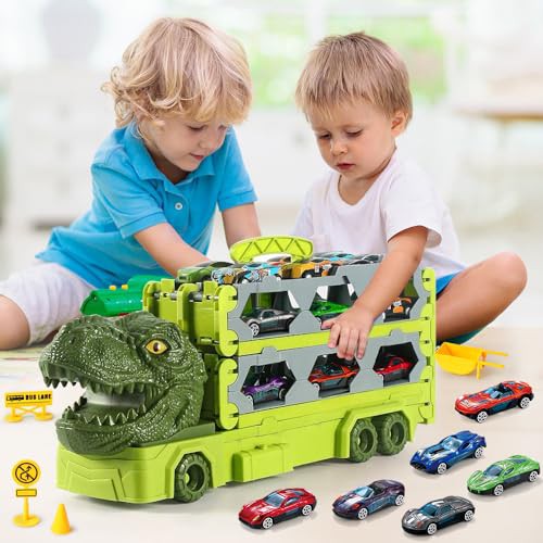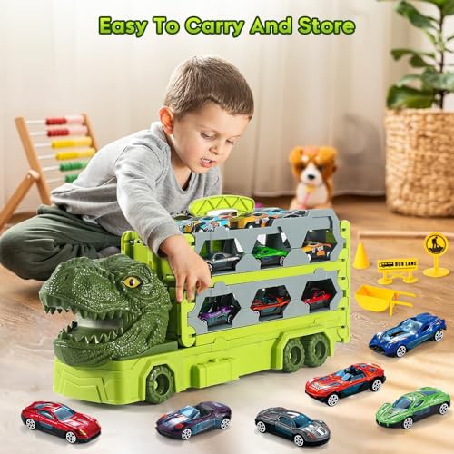 VATOS Transport Truck Toys Cars for Boys Ages 3 4 5 6 7 8, Portable Dinosaur Race Track Truck Toy Car with 6 Race Cars, Best Gift Carrier Truck Vehicles Toys Set for Kids
