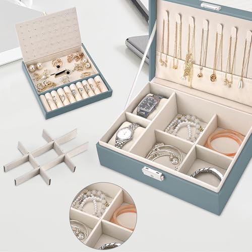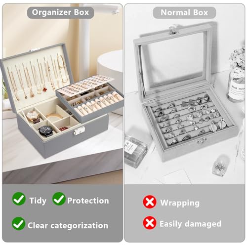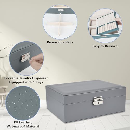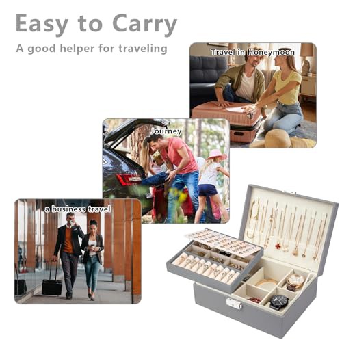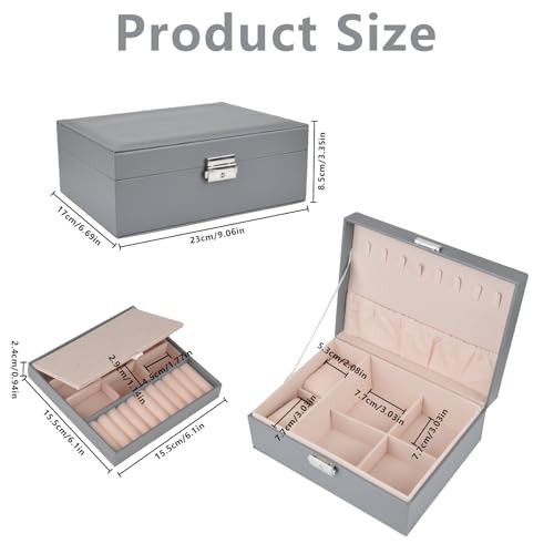 Moseem Jewellery Box Organiser for Women Girls,2-Layer Large Jewellery Organiser Box with 2 Watch Pillows,Removable Tray,PU Leather Jewellery Boxes for Earrings Rings Necklaces Watches Bracelets,Grey