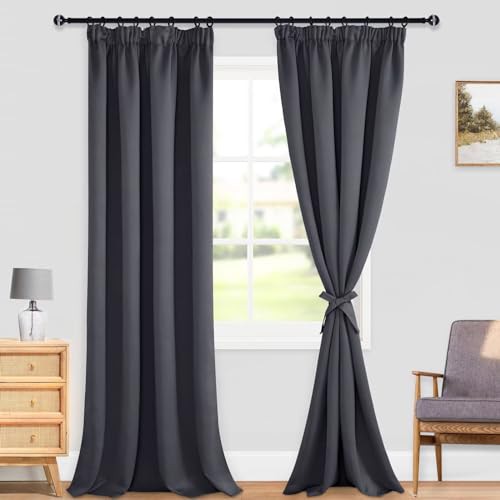 DWCN Dark Grey Curtains Blackout Curtains for Bedroom Thermal Insulated Curtain Pencil Pleat Window Curtains for Living Room with Tiebacks 55 x 96 inch Length, Dark Grey, 2 Panels