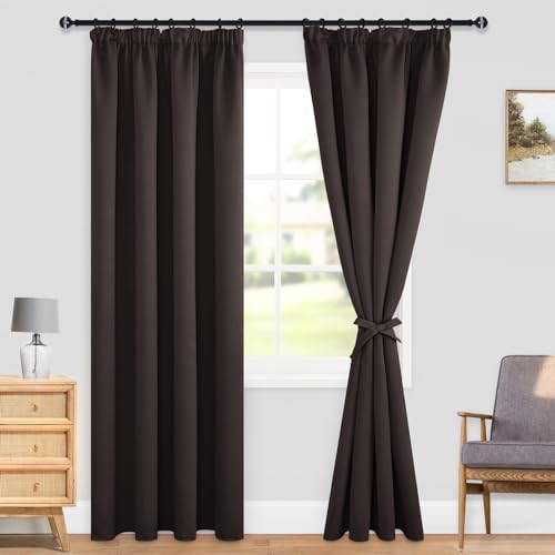 DWCN Wide Curtains with Tiebacks Blackout Curtains Pencil Pleat for Bedroom Thermal Insulated Curtains for Living Room 66 x 72 inch Length, Brown, 2 Panels