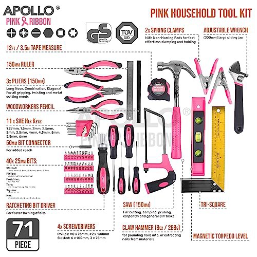 Apollo 71pc Home & Office DIY Tool Kit Set. Complete Household Tool Box with Essential Hand Tools Included for Basic General Repairs & Maintenance