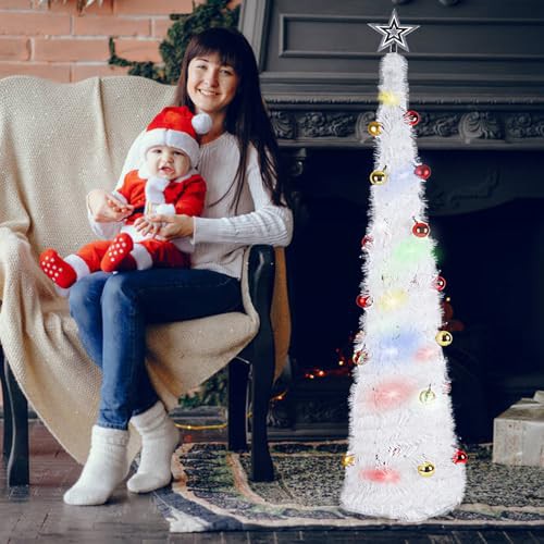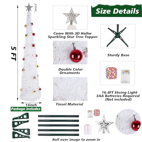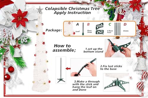 JUNIOO 1.5M/5FT Collapsible Artificial Christmas Tree, Pop-up Christmas Tree with 30pcs Balls and Silver Tree Top Star for Family Gathering Xmas Tree Indoor and Outdoor Christmas Decoration